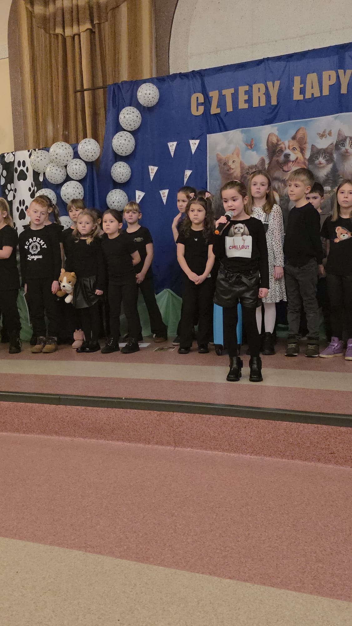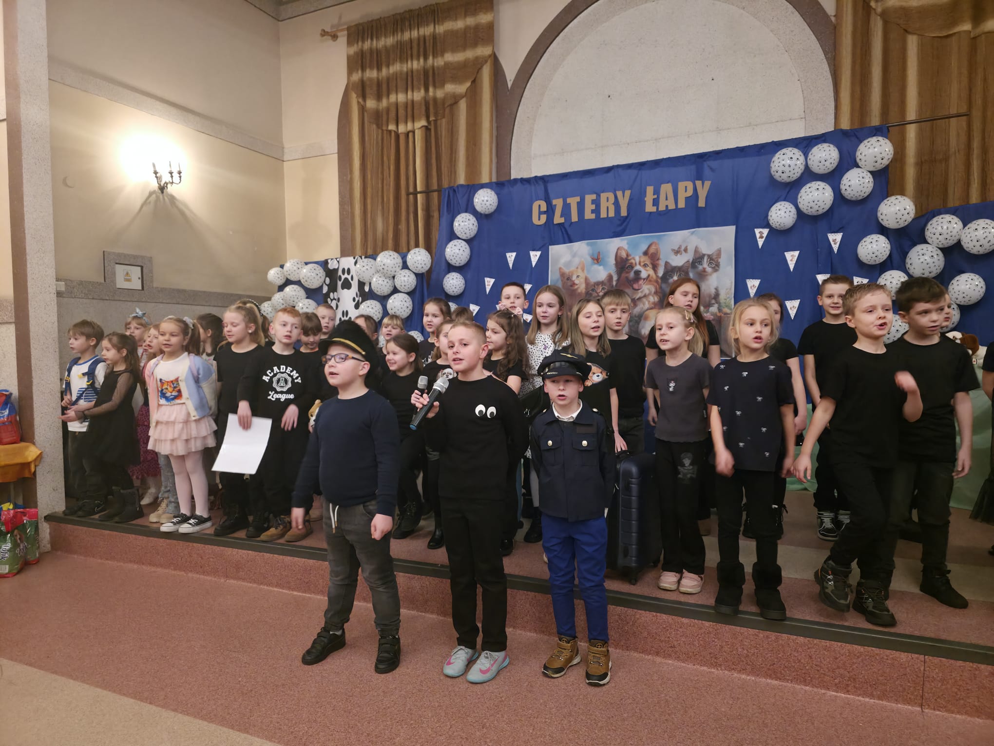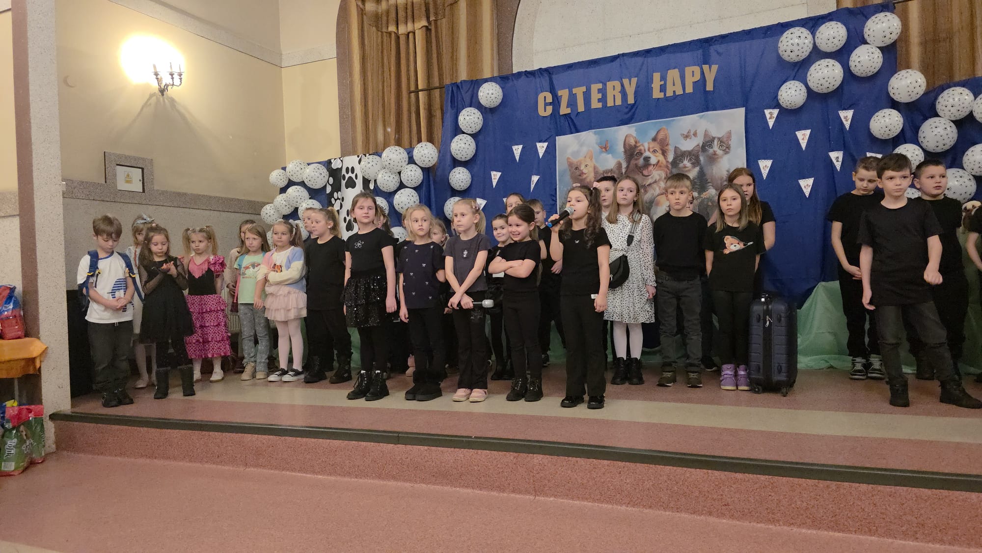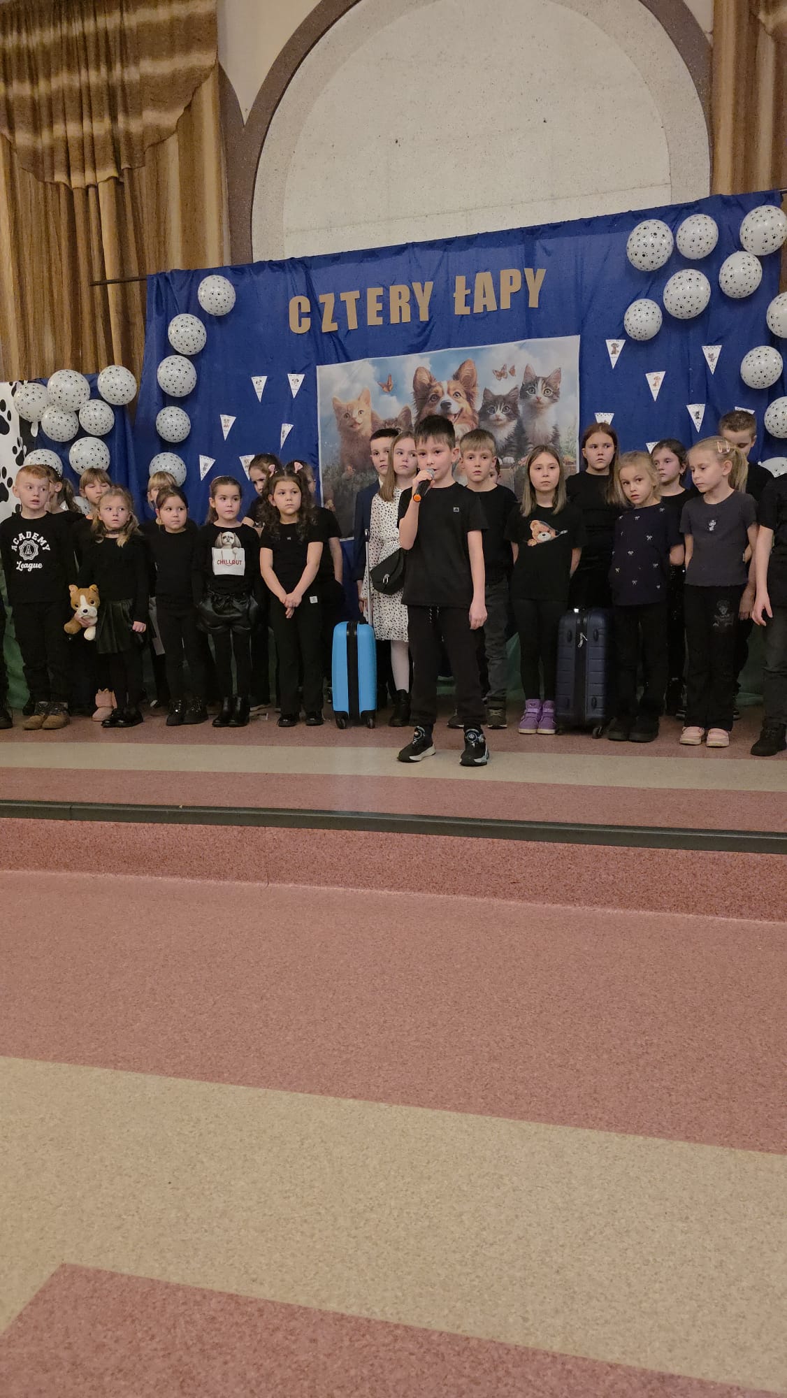 8 grudnia uczniowie klasy 1a i 2a z wychowawczyniami (K. Wachowska i M. Kurzynoga) zaprosili do szkoły swoich bliskich na premierę Koncertu Na 4 łapy, który był finałem Akcji Charytatywnej na rzecz schroniska dla bezdomnych zwierząt. Biletem wstępu była puszka karmy. Goście dopisali. Szczelnie zapełnili miejsca w szkolnej auli. Dzieci dziękując za wsparcie dla ukochanych zwierzaków zabrali wszystkich w Podróż Na Stację 4 łapy. Były piosenki, wierszyki, inscenizacje. Było pięknie. Brawa dla aktorów, dla Rodziców oraz wszystkich, którzy wsparli akcję. Zebraliśmy do tej pory 190 kg karmy. W szkole cały czas jest Kącik Adopcyjny. Można przyjść i zakochać się, a potem adoptować małego kociaka. Fotografie kotków do adopcji udostępniła Pani Luiza Gawrońska. Dekorację na nasz Koncert przygotowała dla nas Pani Magdalena Pietrzak. Dziękujemy ? Razem możemy więcej ??⬛?