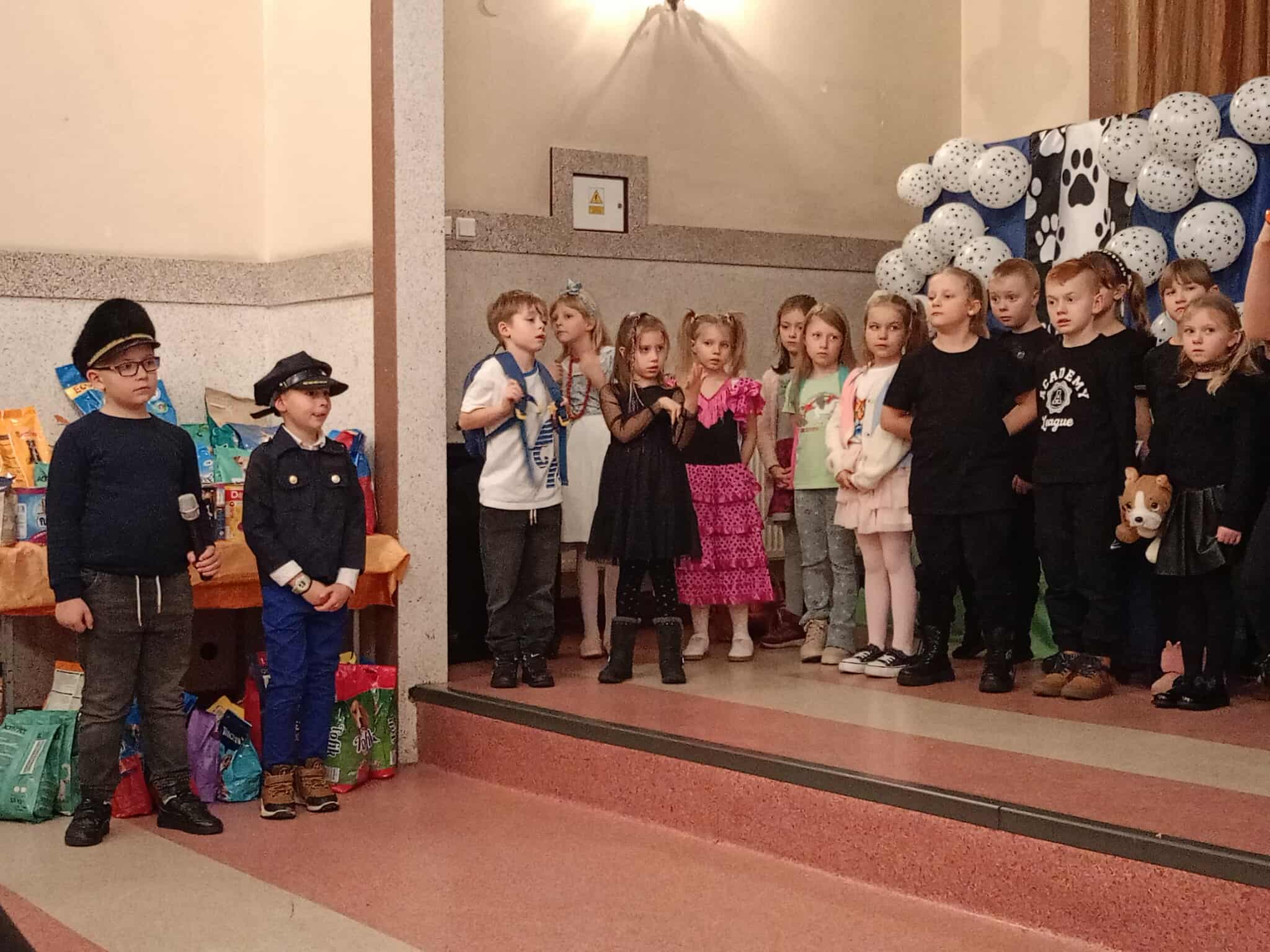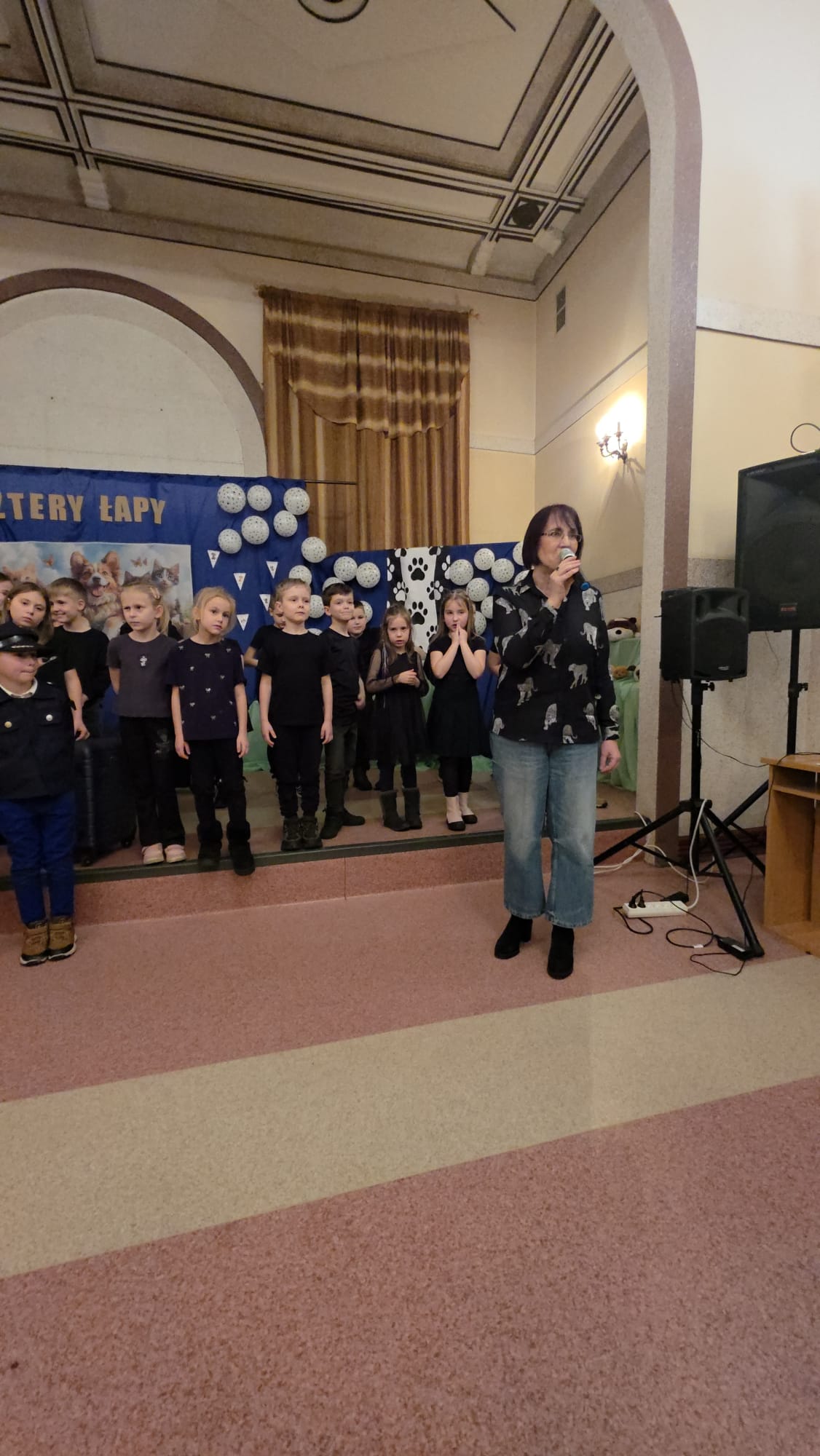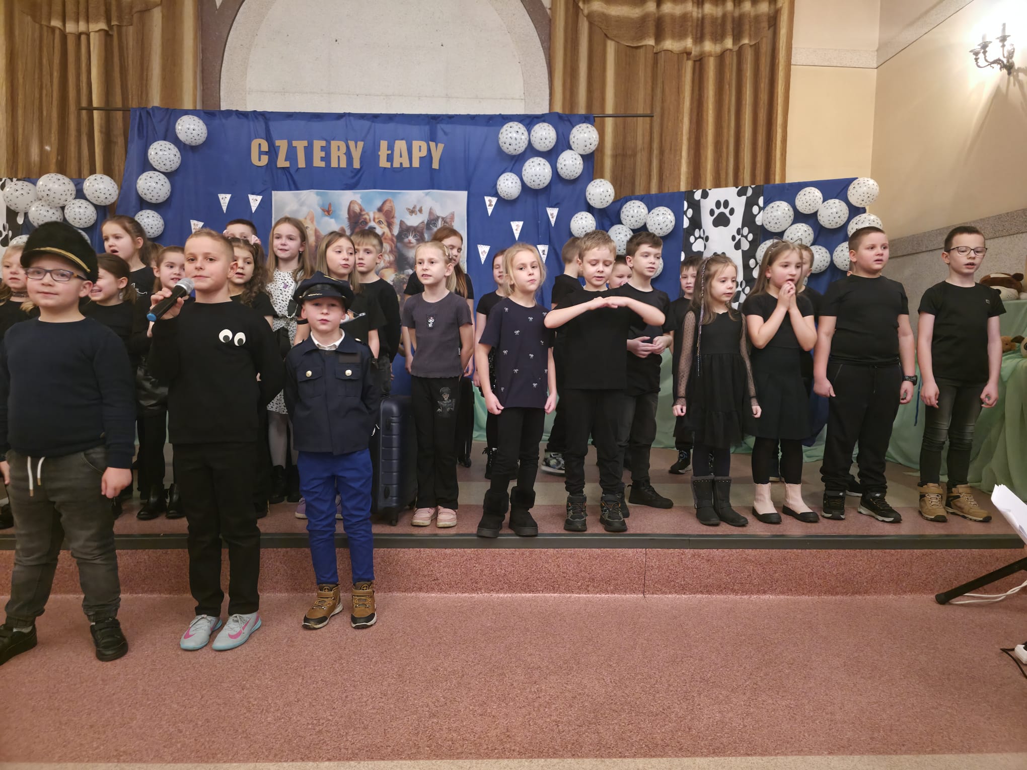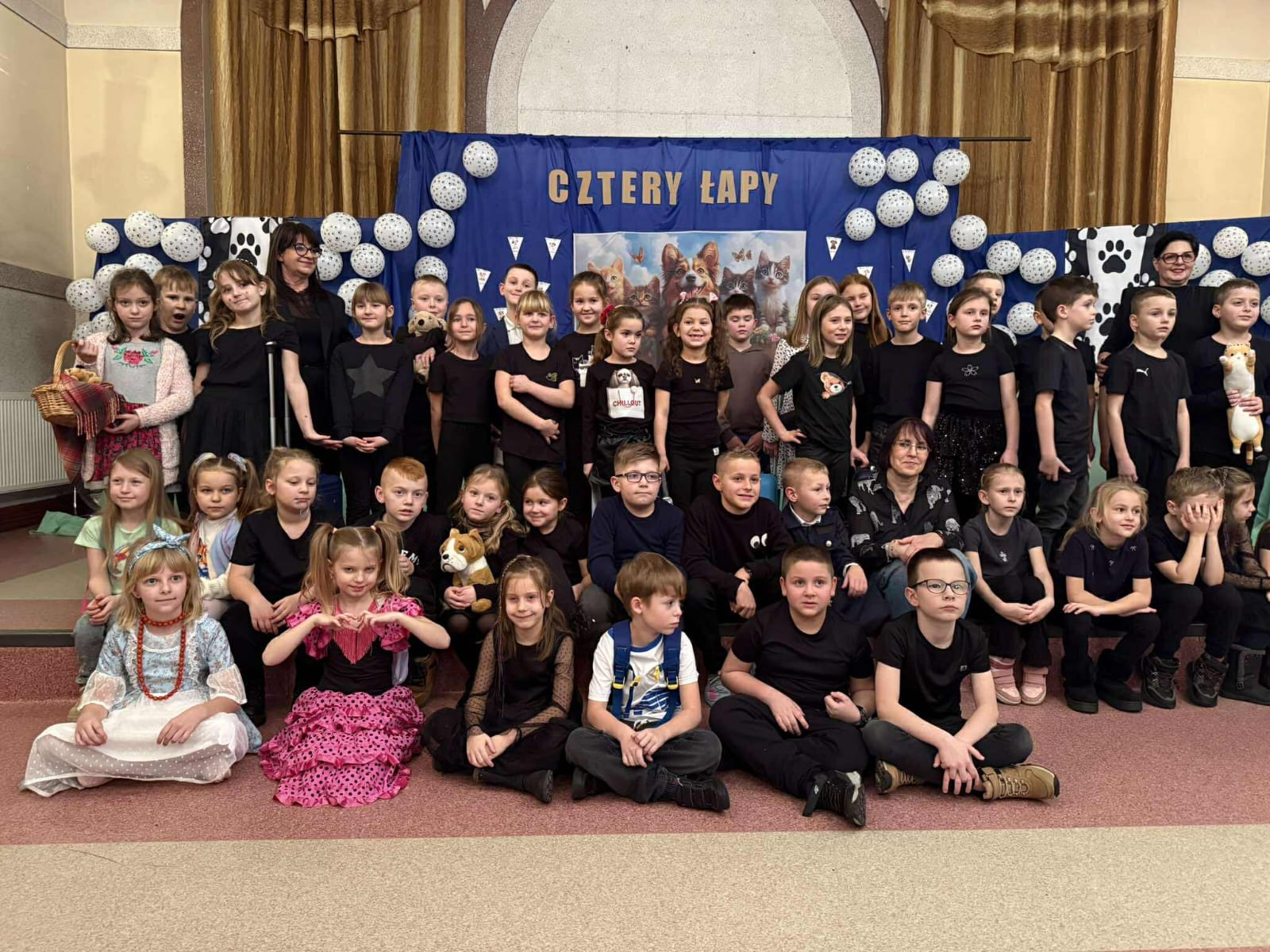 8 grudnia uczniowie klasy 1a i 2a z wychowawczyniami (K. Wachowska i M. Kurzynoga) zaprosili do szkoły swoich bliskich na premierę Koncertu Na 4 łapy, który był finałem Akcji Charytatywnej na rzecz schroniska dla bezdomnych zwierząt. Biletem wstępu była puszka karmy. Goście dopisali. Szczelnie zapełnili miejsca w szkolnej auli. Dzieci dziękując za wsparcie dla ukochanych zwierzaków zabrali wszystkich w Podróż Na Stację 4 łapy. Były piosenki, wierszyki, inscenizacje. Było pięknie. Brawa dla aktorów, dla Rodziców oraz wszystkich, którzy wsparli akcję. Zebraliśmy do tej pory 190 kg karmy. W szkole cały czas jest Kącik Adopcyjny. Można przyjść i zakochać się, a potem adoptować małego kociaka. Fotografie kotków do adopcji udostępniła Pani Luiza Gawrońska. Dekorację na nasz Koncert przygotowała dla nas Pani Magdalena Pietrzak. Dziękujemy ? Razem możemy więcej ??⬛?