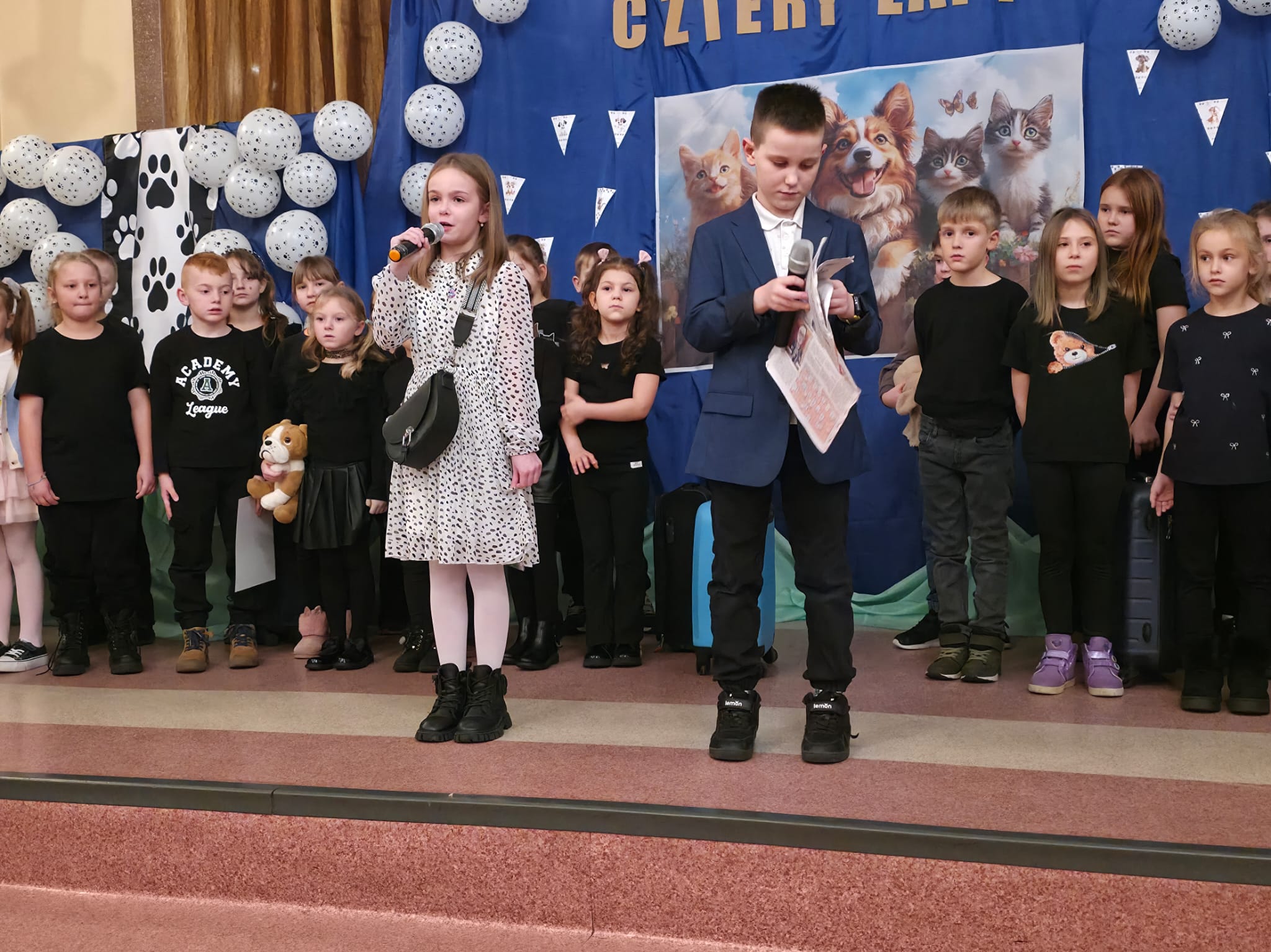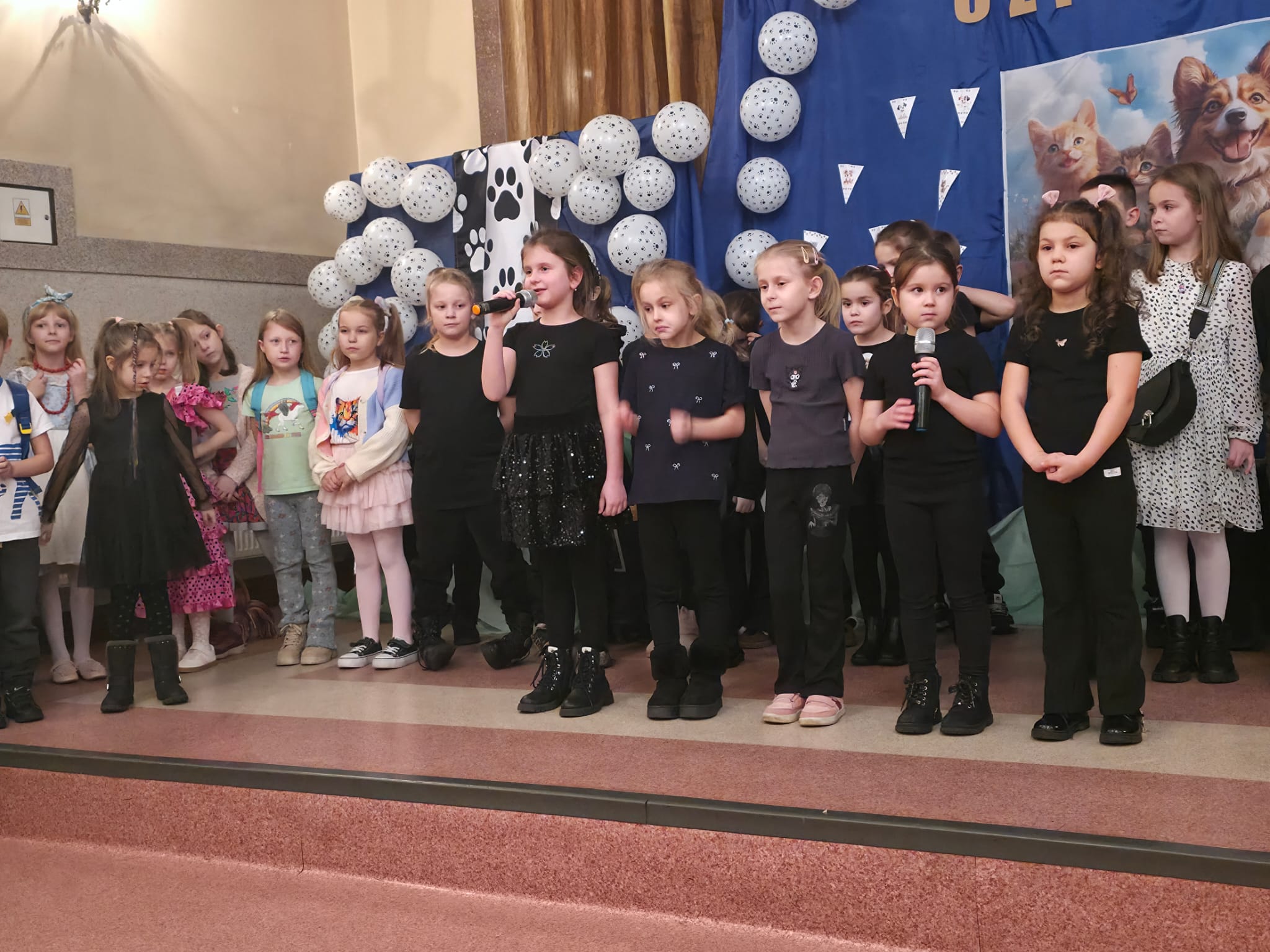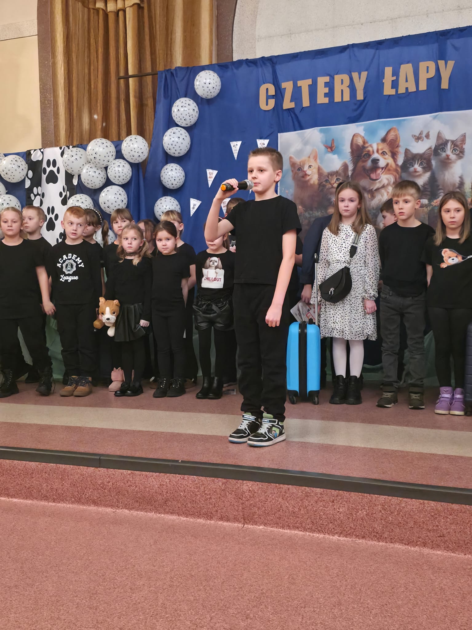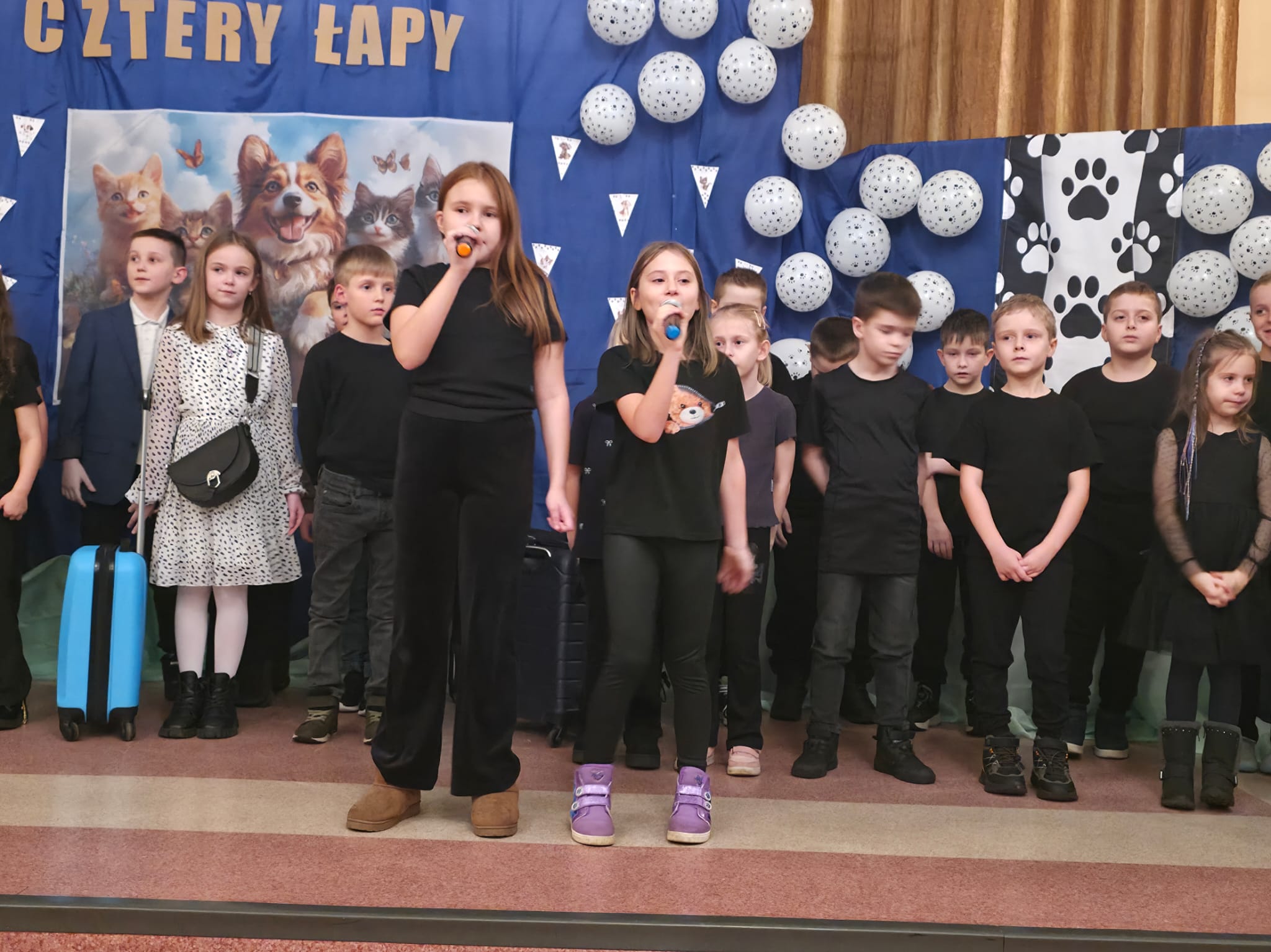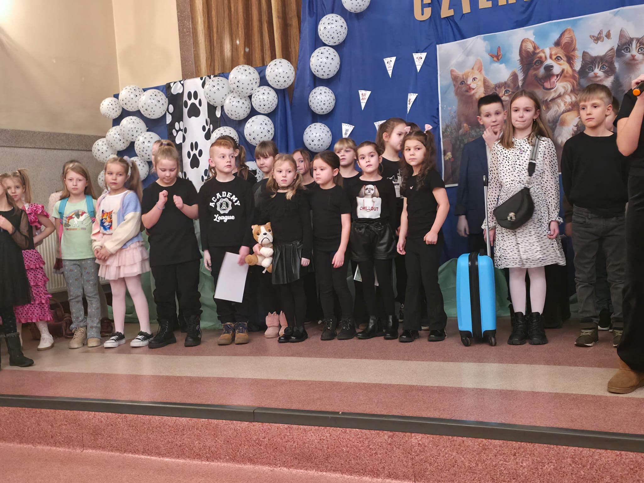 8 grudnia uczniowie klasy 1a i 2a z wychowawczyniami (K. Wachowska i M. Kurzynoga) zaprosili do szkoły swoich bliskich na premierę Koncertu Na 4 łapy, który był finałem Akcji Charytatywnej na rzecz schroniska dla bezdomnych zwierząt. Biletem wstępu była puszka karmy. Goście dopisali. Szczelnie zapełnili miejsca w szkolnej auli. Dzieci dziękując za wsparcie dla ukochanych zwierzaków zabrali wszystkich w Podróż Na Stację 4 łapy. Były piosenki, wierszyki, inscenizacje. Było pięknie. Brawa dla aktorów, dla Rodziców oraz wszystkich, którzy wsparli akcję. Zebraliśmy do tej pory 190 kg karmy. W szkole cały czas jest Kącik Adopcyjny. Można przyjść i zakochać się, a potem adoptować małego kociaka. Fotografie kotków do adopcji udostępniła Pani Luiza Gawrońska. Dekorację na nasz Koncert przygotowała dla nas Pani Magdalena Pietrzak. Dziękujemy ? Razem możemy więcej ??⬛?
