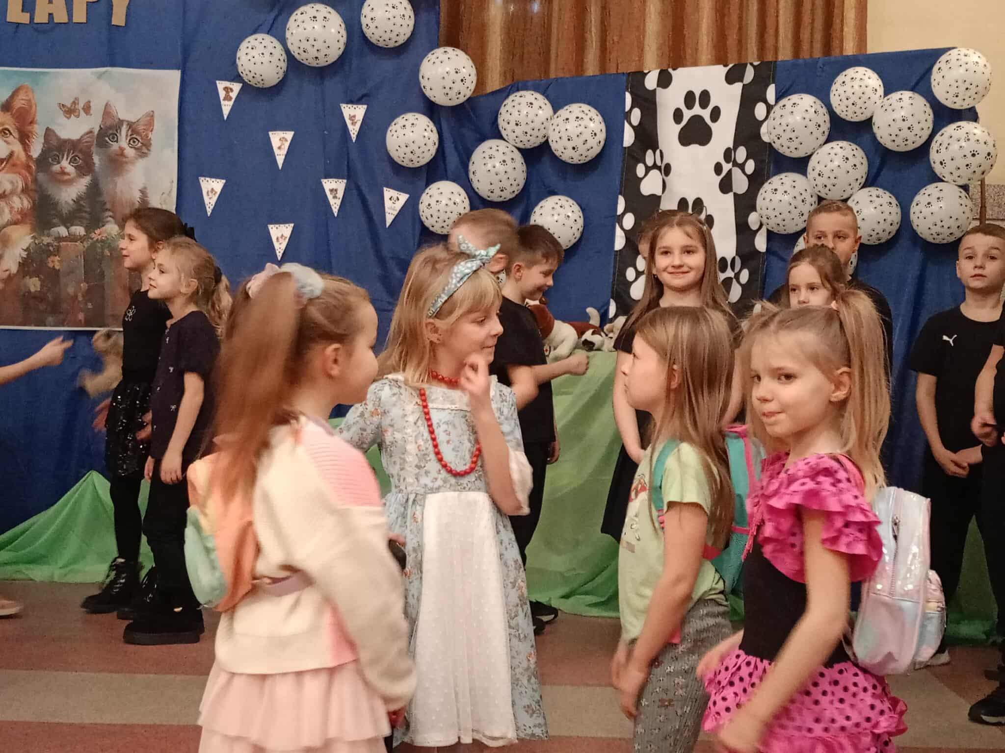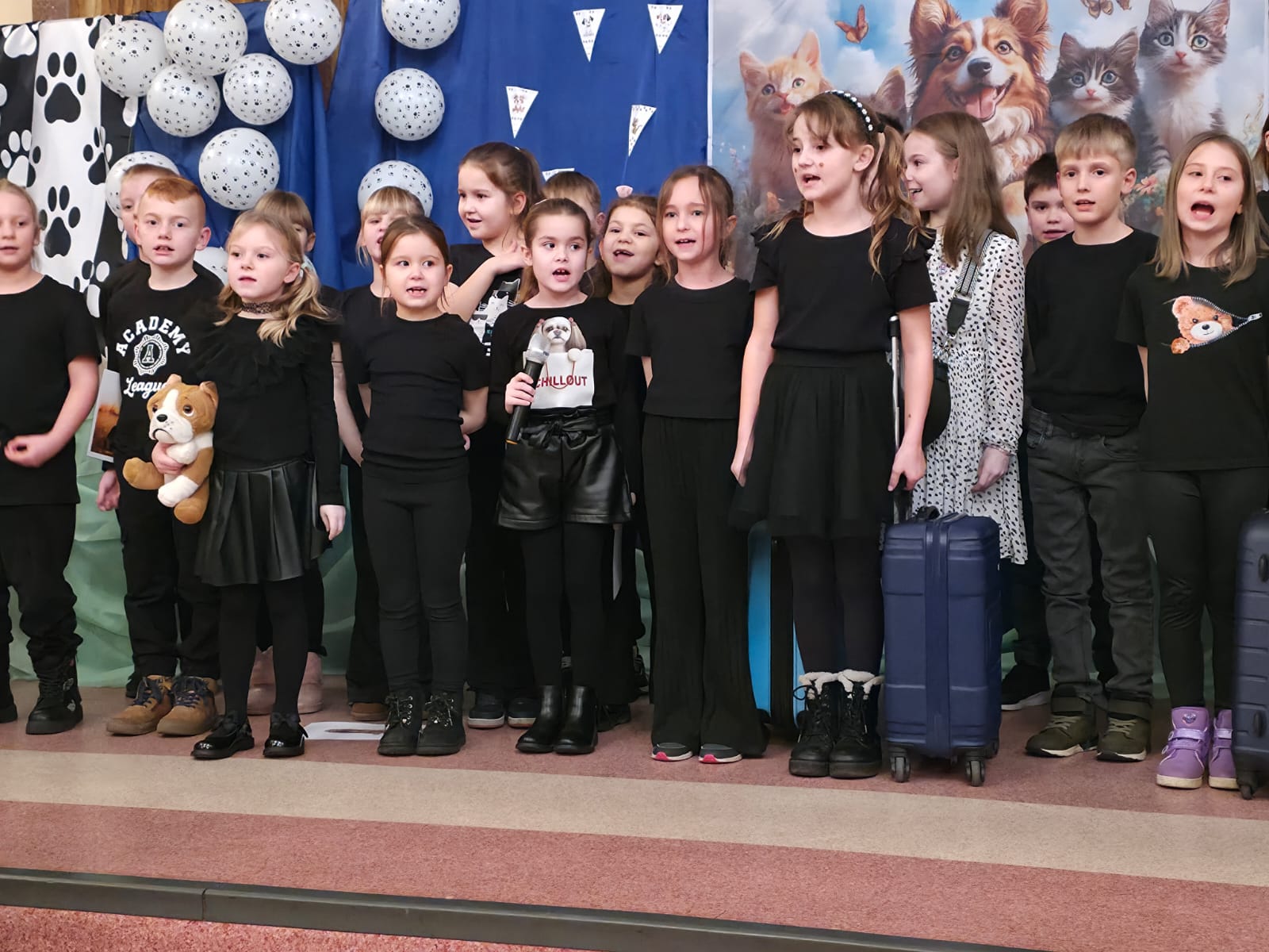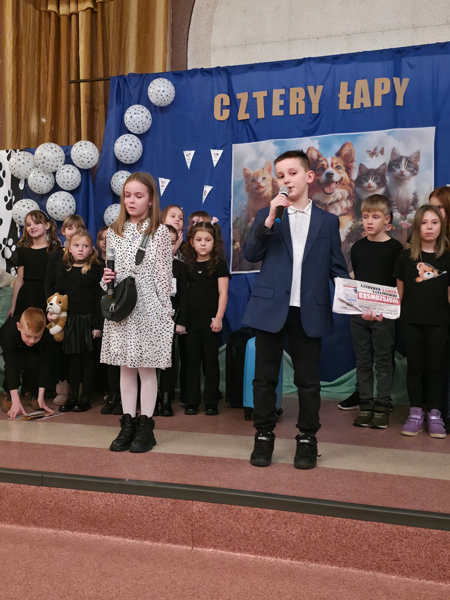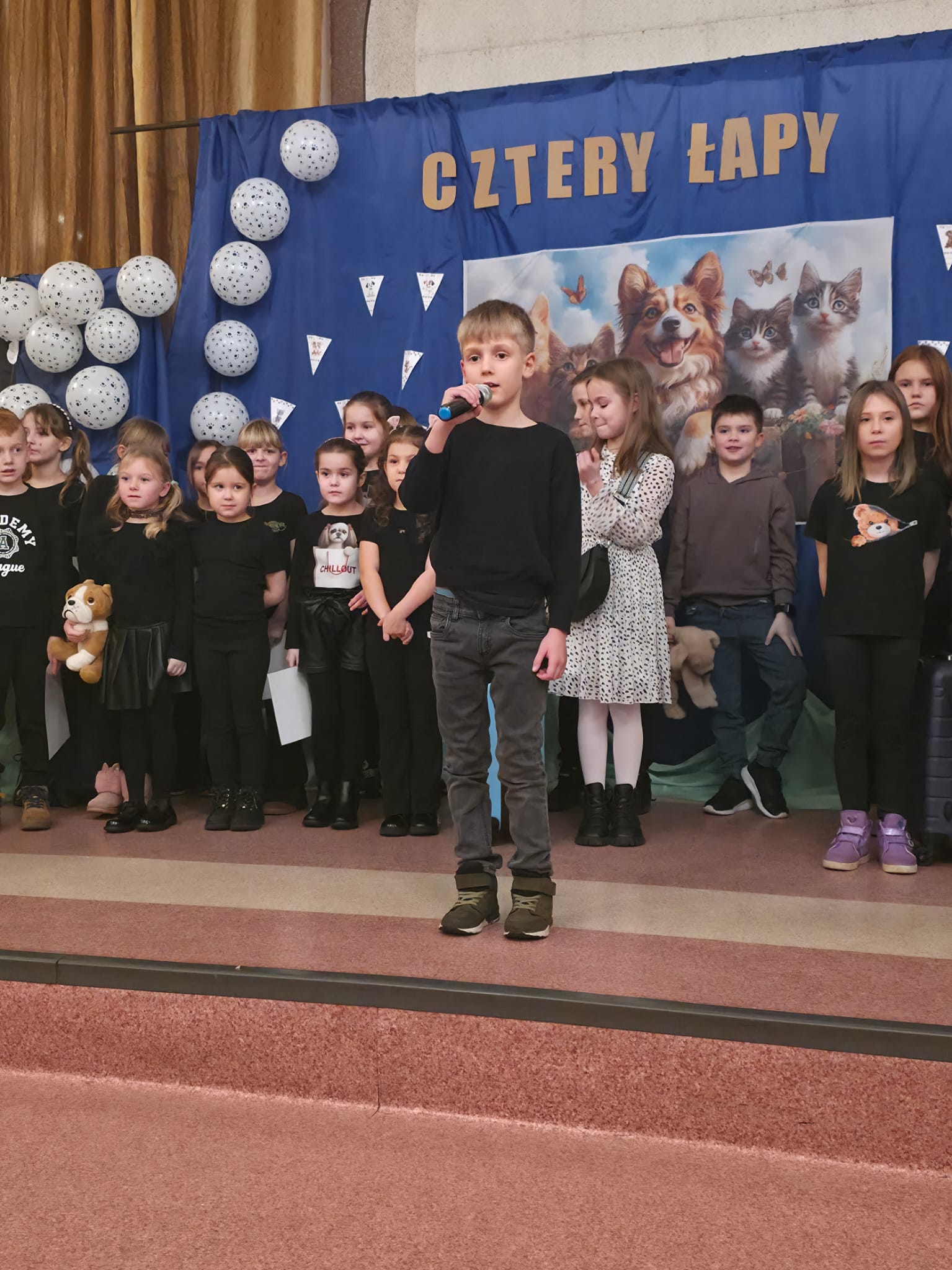 8 grudnia uczniowie klasy 1a i 2a z wychowawczyniami (K. Wachowska i M. Kurzynoga) zaprosili do szkoły swoich bliskich na premierę Koncertu Na 4 łapy, który był finałem Akcji Charytatywnej na rzecz schroniska dla bezdomnych zwierząt. Biletem wstępu była puszka karmy. Goście dopisali. Szczelnie zapełnili miejsca w szkolnej auli. Dzieci dziękując za wsparcie dla ukochanych zwierzaków zabrali wszystkich w Podróż Na Stację 4 łapy. Były piosenki, wierszyki, inscenizacje. Było pięknie. Brawa dla aktorów, dla Rodziców oraz wszystkich, którzy wsparli akcję. Zebraliśmy do tej pory 190 kg karmy. W szkole cały czas jest Kącik Adopcyjny. Można przyjść i zakochać się, a potem adoptować małego kociaka. Fotografie kotków do adopcji udostępniła Pani Luiza Gawrońska. Dekorację na nasz Koncert przygotowała dla nas Pani Magdalena Pietrzak. Dziękujemy ? Razem możemy więcej ??⬛?