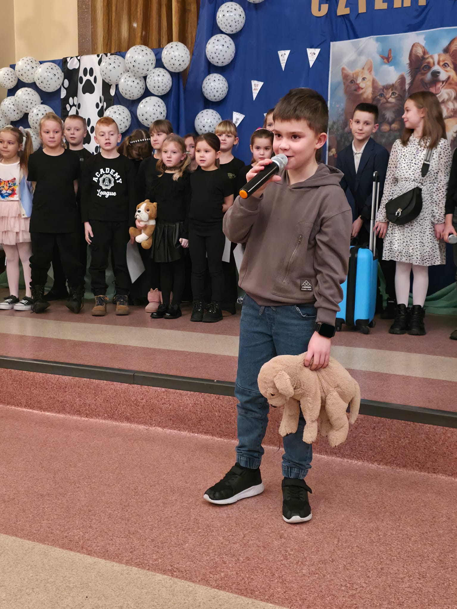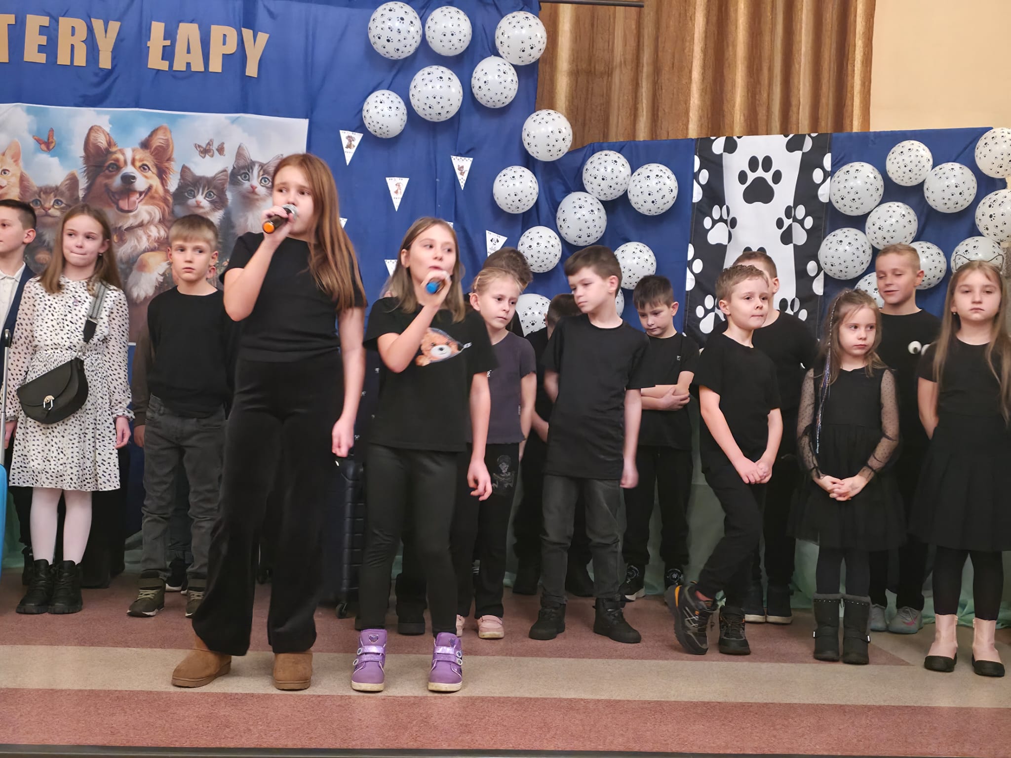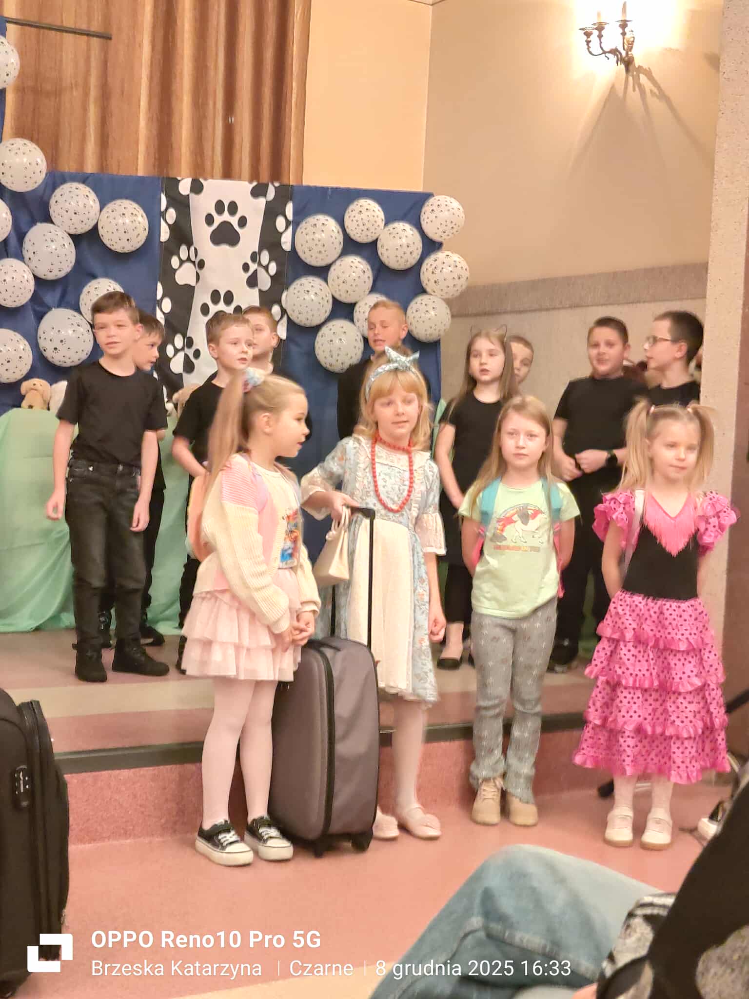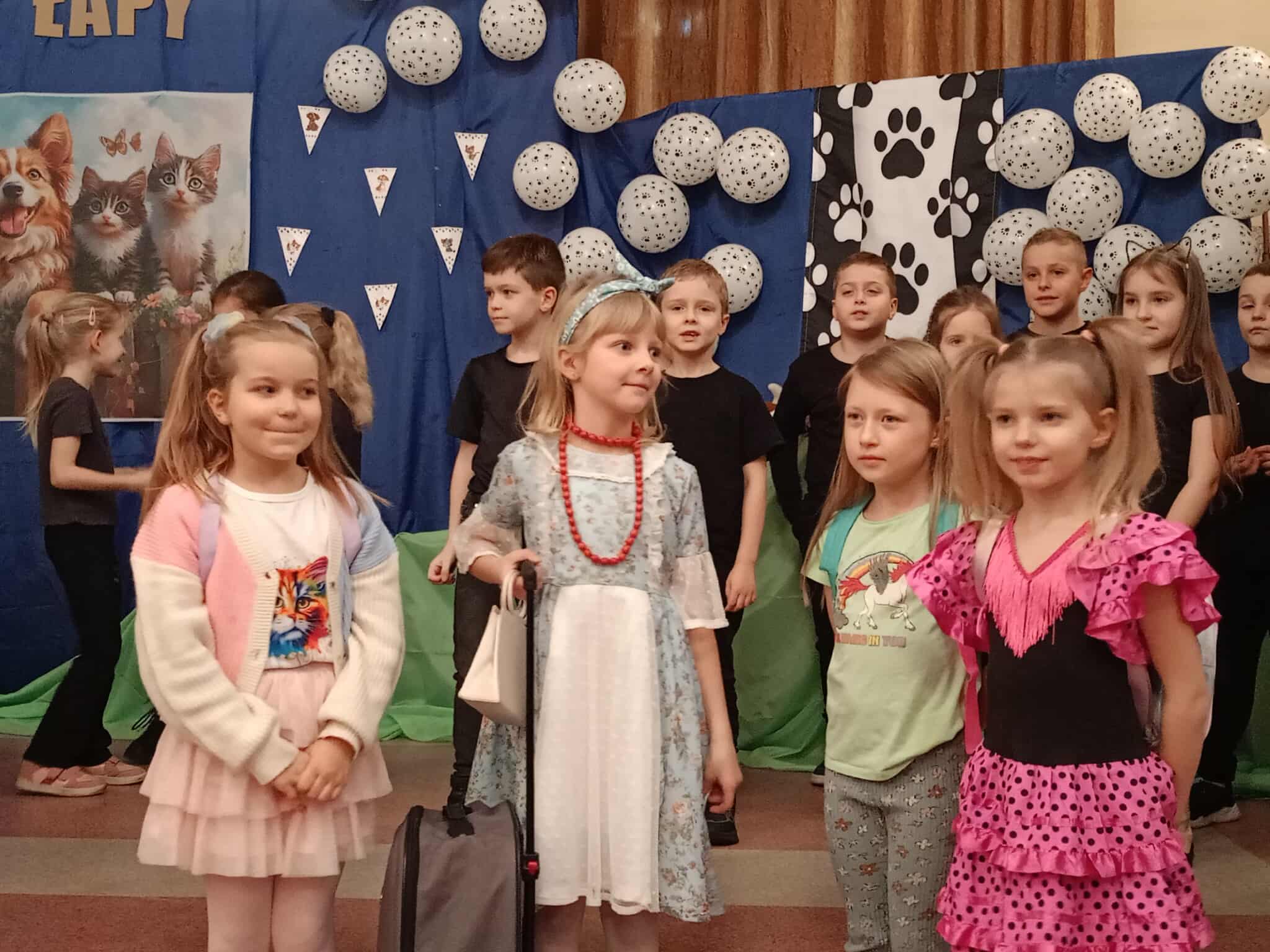 8 grudnia uczniowie klasy 1a i 2a z wychowawczyniami (K. Wachowska i M. Kurzynoga) zaprosili do szkoły swoich bliskich na premierę Koncertu Na 4 łapy, który był finałem Akcji Charytatywnej na rzecz schroniska dla bezdomnych zwierząt. Biletem wstępu była puszka karmy. Goście dopisali. Szczelnie zapełnili miejsca w szkolnej auli. Dzieci dziękując za wsparcie dla ukochanych zwierzaków zabrali wszystkich w Podróż Na Stację 4 łapy. Były piosenki, wierszyki, inscenizacje. Było pięknie. Brawa dla aktorów, dla Rodziców oraz wszystkich, którzy wsparli akcję. Zebraliśmy do tej pory 190 kg karmy. W szkole cały czas jest Kącik Adopcyjny. Można przyjść i zakochać się, a potem adoptować małego kociaka. Fotografie kotków do adopcji udostępniła Pani Luiza Gawrońska. Dekorację na nasz Koncert przygotowała dla nas Pani Magdalena Pietrzak. Dziękujemy ? Razem możemy więcej ??⬛?
