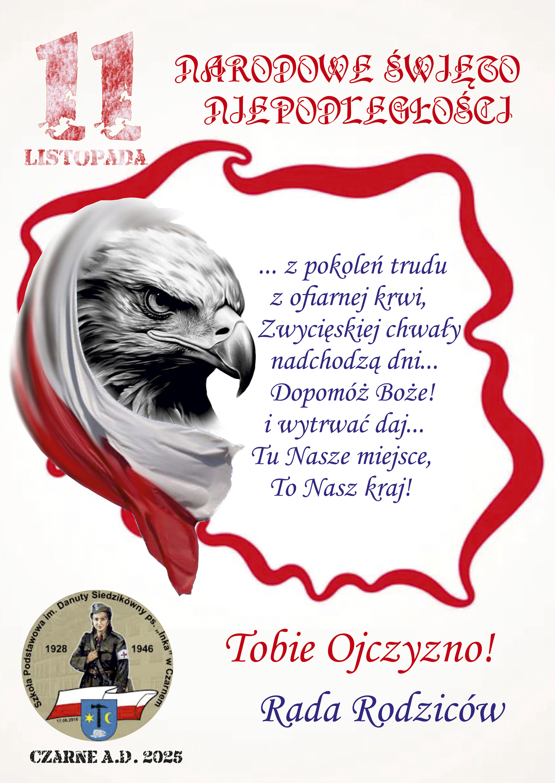 „Śladami Niepodległości – pamiętając o Danucie Siedzikównie ps. »Inka«” 11 listopada obchodzimy jedno z najważniejszych świąt w historii naszego kraju – Narodowe Święto Niepodległości. To dzień, w którym wspominamy odzyskanie przez Polskę wolności po 123 latach zaborów. Dzień, w którym wspólna pamięć o bohaterach i miłość do Ojczyzny nabierają szczególnego znaczenia. W naszej szkole – Szkole Podstawowej im. Danuty Siedzikówny „Inki” w Czarnem – święto to ma wyjątkowy wymiar. Nasza patronka, młoda sanitariuszka Armii Krajowej, stała się symbolem odwagi, wierności wartościom i bezgranicznej miłości do Polski. Miała zaledwie 17 lat, gdy została rozstrzelana w 1946 roku za wierność swoim przekonaniom. W chwili śmierci powiedziała słowa, które przeszły do historii: „Powiedzcie mojej babci, że zachowałam się jak trzeba.” Dziś, kiedy żyjemy w wolnym kraju, jej postawa przypomina nam, że niepodległość nie jest dana raz na zawsze – trzeba o nią dbać, pielęgnując w sobie uczciwość, odwagę i szacunek do innych. Obchody 11 listopada to nie tylko akademie i hymny, ale także moment refleksji. Dla nas, uczniów szkoły imienia „Inki”, to dzień, by zastanowić się, co znaczy być patriotą w XXI wieku. To może być uśmiech do drugiego człowieka, troska o lokalną wspólnotę, pomoc słabszym – bo patriotyzm to nie tylko walka, ale też codzienne wybory dobra. Niech przykład „Inki” uczy nas, że warto być wiernym sobie i swoim wartościom, nawet gdy jest trudno.