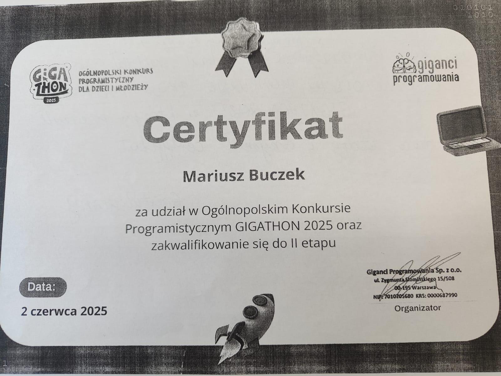 Uczeń klasy 6c, MARIUSZ BUCZEK wziął udział w Ogólnopolskim Konkursie Programistycznym GIGATHON 2025 , w którym przeszedł dwa etapy i otrzymał Certyfikat. Mariusz uczęszczał na zajęcia koła iformatycznego i do konkursu przygotowywał się pod opieką p. Bożeny Witko.